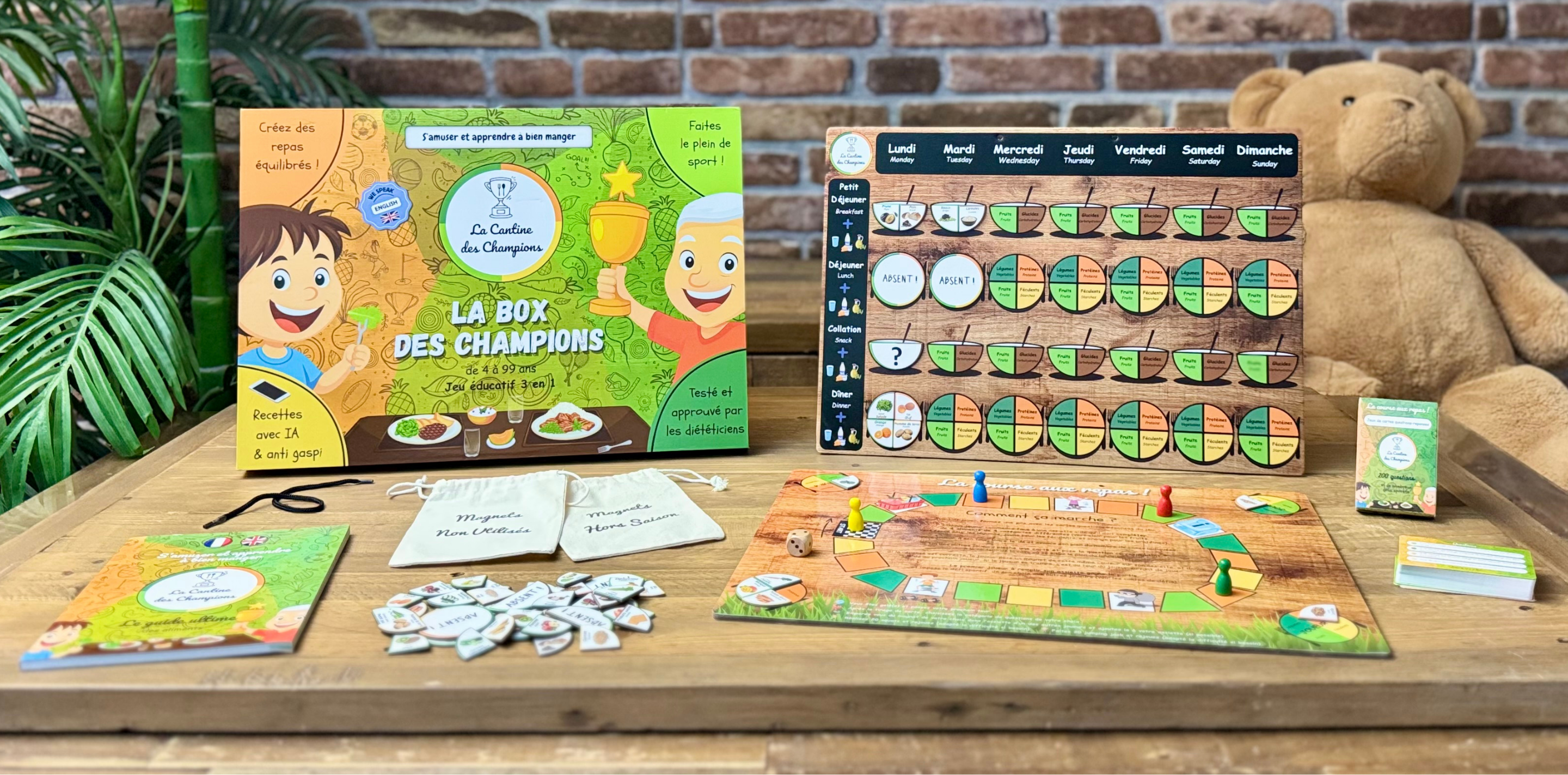 Conçu par des parents, La Box des Champions c'est un jeu de société qui permet de composer des repas équilibrés, d’identifier les aliments avec leur saisonnalité, d'apprendre en s’amusant et de bouger grâce à des défis sportifs.